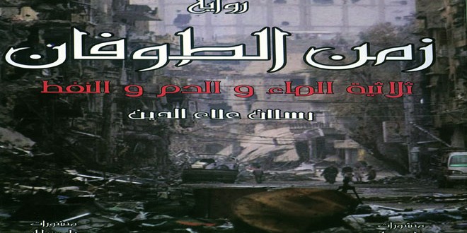 رواية “زمن الطوفان..ثلاثية الماء والدم والنفط” للكاتب رسلان علاء الدين رصد فيها تحولات المؤامرة على سورية مستخدماً الوثيقة الواقعية التي أسقطها على أحداث الرواية بغية الوصول إلى تسجيل معاناة الإنسان السوري عبر تاريخ كان حافلاً بالمحبة والحضارة لم يعرف به السوريون إلا التلاحم الوطني والانتماء الذي يوحد أطياف الشعب.