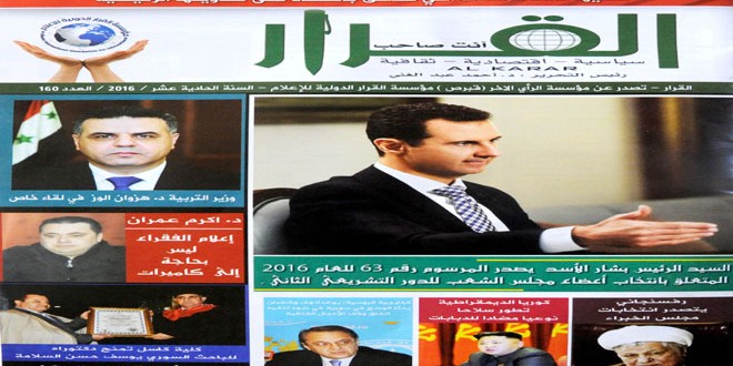 في افتتاحية العدد كتب الدكتور أحمد عبد الغني رئيس التحرير مقالا بعنوان “الفساد السياسي” بين فيه أهمية انتخابات مجلس الشعب ودورها في تمثيل الشرائح الشعبية لذلك لا بد من العمل بشكل جدي من أجل اختيارات واعية تجسد طموحات الشعب في محاربة الفساد الذي يخدم مصلحة المتآمرين على سورية.