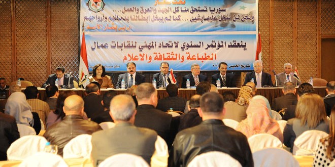 من جهته لفت رئيس الاتحاد العام لنقابات العمال جمال القادري إلى أن مؤتمرات الاتحادات المهنية ستتوج بعقد جلسة للمجلس العام للاتحاد تعالج خلالها جميع القضايا معتبرا أن مناقشات المؤتمر لم تكن بمستوى طموح الطبقة العاملة ولم تقدم أي قيمة مضافة لقطاعات التربية والثقافة والإعلام ولهذا تم اقتراح تشكيل ثلاث لجان الأولى تعنى بالشأن التربوي لمعرفة كل مشاكل وصعوبات هذا القطاع ومتطلبات النهوض به ومعاناة العمالة فيه ولجنة اخرى تعنى بالشق الإعلامي تشخص واقع العمل مهنيا ونقابيا لمعالجة ما يمكن معالجته وثالثة تعنى بالقطاع الثقافي لأن الحرب التي تتعرض لها سورية هي حرب إجرامية تنتمي لقاعدة فكرية تكفيرية تلزم الجميع بالعمل على مواجهة هذه الحرب بوسائل وأدوات فكرية ما يتطلب تفعيل هذا القطاع بشكل أكبر.