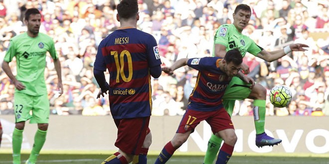 وافتتح خوان دومينغيز لاعب خيتافي أهداف برشلونة بعد ثماني دقائق بالخطأ في مرمى فريقه قبل أن يهدر ميسي ركلة الجزاء الرابعة له هذا الموسم لكنه صنع هدفين متتاليين لمنير الحدادي ونيمار.