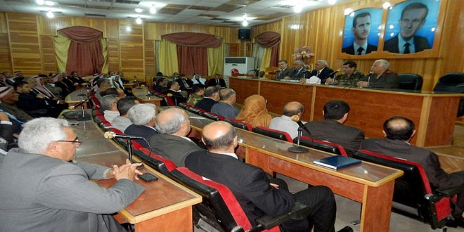 وطالب المجتمعون بالإسراع في تأمين مستلزمات عمل الدوائر الخدمية لتقدم الخدمات للمواطنين وضمان عودة جميع المهجرين إلى منازلهم وزيادة المساعدات الإغاثية العاجلة للأهالي معربين عن وقوفهم إلى جانب الجيش العربي السوري في مواجهة التنظيمات الإرهابية.