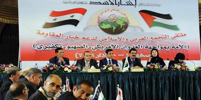 وكان ملتقى التجمع العربي والإسلامي لدعم خيار المقاومة الذي اختتم أعماله في دمشق أمس أكد على تعزيز ثقافة المقاومة بوصفها الخيار الأمثل والوحيد لإجهاض المؤامرة والحرب الكونية على سورية والأمة العربية والإسلامية وعلى قواها المقاومة.