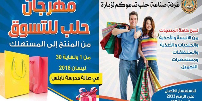 أعلنت غرفة صناعة حلب اقامة مهرجان حلب للتسوق تحت عنوان “من المنتج إلى المستهلك” لبيع جميع المنتجات من الألبسة والأحذية والجلديات والأغذية والمنظفات ومستحضرات التجميل ابتداء من شهر نيسان القادم وحتى نهايته وذلك في صالة مدرسة نابلس.