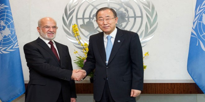 ووفقا لبيان صادر عن الخارجية العراقية دعا الجعفري خلال لقائه الأمين العام للأمم المتحدة بان كي مون في بغداد اليوم الأمم المتحدة والمنظمات الدولية إلى تنظيم مؤتمر بشأن إعادة إعمار البنى التحتية للمناطق العراقية المحررة لعودة سكانها مطالبا الأمم المتحدة ودول العالم بتقديم المساعدة وعلاج المصابين جراء القصف الكيماوي الذي نفذه تنظيم “داعش” الإرهابي في قرية تازة شمال العراق مؤخرا.