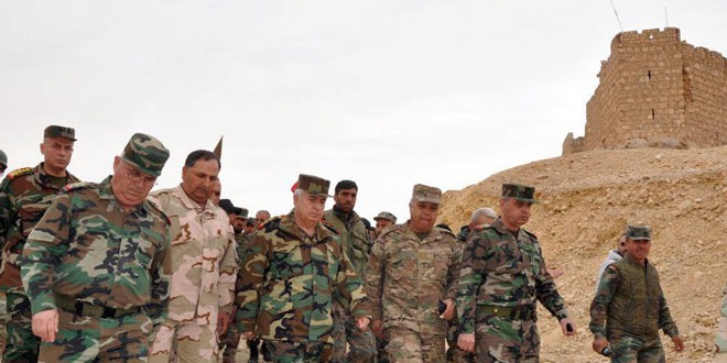 بتوجيه من السيد الرئيس الفريق بشار الأسد القائد العام للجيش والقوات المسلحة قام العماد علي عبد الله أيوب رئيس هيئة الأركان العامة للجيش والقوات المسلحة يرافقه عدد من ضباط القيادة العامة بجولة ميدانية تفقد خلالها وحدات الجيش والقوات المسلحة العاملة على اتجاه تدمر بريف حمص الشرقي.