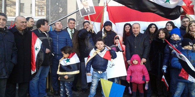 نظمت الجالية السورية في أوكرانيا بالتعاون مع جمعية الصداقة الأوكرانية السورية اليوم وقفة تضامنية مع سورية في حربها ضد الإرهاب أمام مقر السفارة السورية في العاصمة كييف.
