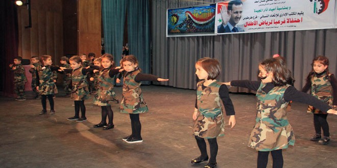 من جانبها أوضحت زهور علي رئيسة مكتب رعاية الطفولة المبكرة أن النشاط يأتي ضمن خطة الاتحاد في رعاية الأطفال وتنمية مواهبهم وحسهم الفني والأدبي لافتة إلى أن كل روضة شاركت بالحفل قدمت فقرة فنية خاصة تعالج جانبا من جوانب الحرب على سورية وتعلم الطفل حب الوطن والعمل على التضحية من أجله إضافة إلى احترام قدسية الشهادة والشهداء.