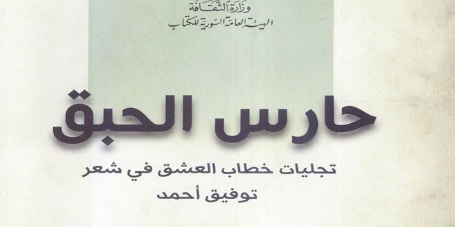 يحاول الناقد الدكتور هايل محمد الطالب في كتابه “حارس الحبق” تلافي الثغرات التي أشار إليها بعض النقاد في ملاحظاتهم على الطبعة الأولى من الكتاب الذي يرصد تجليات خطاب العشق في شعر توفيق أحمد وفق منهج تطبيقي وتحليلي حاول أن يلم خلالها بأغلب الجوانب التي جاء بها الشاعر أحمد ويعتمد الشاعر أحمد في معظم قصائده على استخدام الدلالة ليبتعد في أسلوبه التعبيري عن المباشرة حسب الدكتور الطالب فأحيانا يستخدم كلمة عين لتكون مركبا دلاليا في ألفاظه في بعض قصائده عندما يعمل على بناء التكنيك الفني وأسلوبية التعبير مستشهدا في قصيدة “أميرة الحب والعشق”.. “هل لعينيك في المدى من رفاقي..تجمعان العشاق بالعشاق وهما عالمي ولو سألاني ..لاستحى الضوء والندى والسواقي من إلى ناظريك زف الليالي..راسما لوحة الجمال الباقي”.