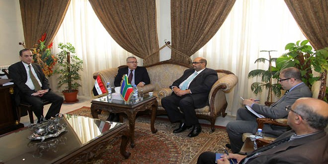 بحث وزير الموارد المائية الدكتور كمال الشيخة مع سفير جمهورية جنوب أفريقيا بدمشق شون بينفيلدت اليوم آفاق التعاون بين البلدين في مجالات قطاعي مياه الشرب والصرف الصحي.