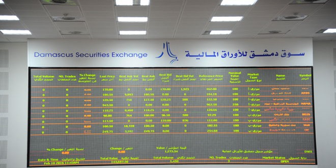 مؤشر سوق دمشق للأوراق المالية يرتفع 17ر3 نقاط وقيمة التداولات 324ر19 مليون ليرة