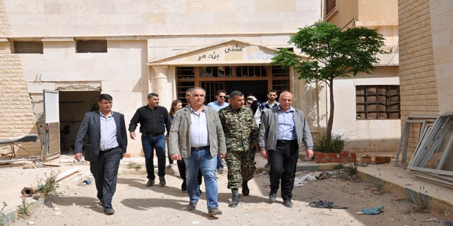 اطلع محافظ حمص طلال البرازي خلال زيارته اليوم مدينة تدمر على واقع المشفى الوطني والفرن الآلي وفوج الإطفاء والثانوية الصناعية والاحتياجات الخدمية الأكثر ضرورة لعودة الأهالي إلى المدينة بعد تطهيرها من إرهابيي “داعش”.