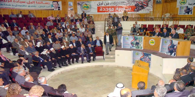 من جهته رأى المستشار في القيادة القطرية لحزب البعث العربي الاشتراكي والرئيس الفخري لاتحاد الصحفيين الدكتور صابر فلحوط ضرورة حشد جميع الطاقات لتحقيق النصر المؤزر على الهجمة الشرسة التي تتعرض لها سورية بأدوات رجعية ووهابية ارهابية ومال ونفط خليجي منوها ببطولات وتضحيات الجيش العربي السوري العقائدي الذي يسطر ملاحم البطولة في مواجهة الإرهاب لتطهير ارض الوطن من رجسه وإعادة الأمن والاستقرار.