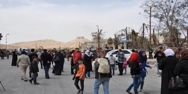وأكد محافظ حمص طلال البرازي بدء عودة المهجرين من أهالي تدمر إلى منازلهم اليوم مع استمرار قوات الهندسة في الجيش العربي السوري بالتعاون مع القوات الروسية بتفكيك الالغام والعبوات الناسفة في محيط المدينة لافتا إلى ان ورش الخدمات الأساسية بدأت عملها في قطاع الكهرباء والاتصالات والمياه وقطعت شوطا مقبولا.
