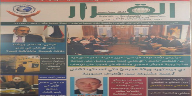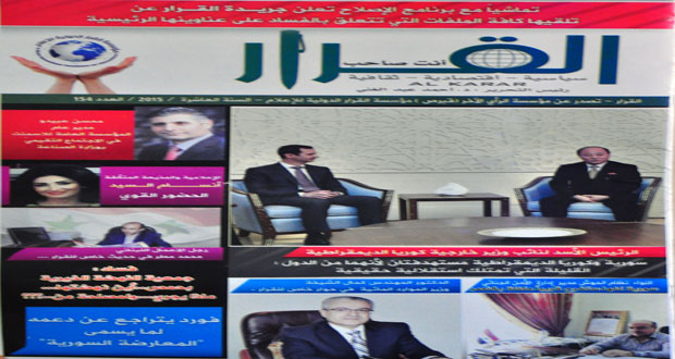 وتضمن العدد لقاء مع القاضي احمد السيد المحامي العام الأول في مدينة دمشق حمل عنوان نحو قضاء .. عادل .. وسريع .. وزاوية بعنوان آثار الحرب على الاقتصاد بقلم الدكتورة راما عدنان زريق .