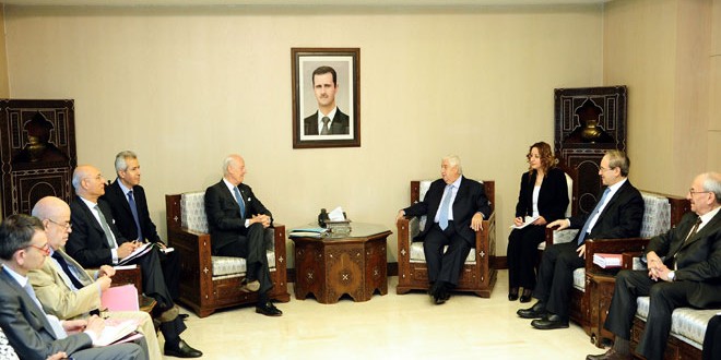 استقبل وليد المعلم نائب رئيس مجلس الوزراء وزير الخارجية والمغتربين صباح اليوم ستافان دى ميستورا المبعوث الخاص للأمين العام للأمم المتحدة إلى سورية والوفد المرافق.