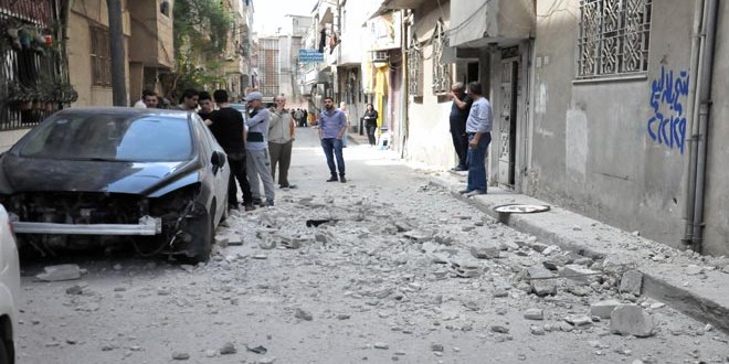 سقوط قذيفتين صاروخيتين أطلقهما إرهابيون على حي النزهة في مدينة حمص