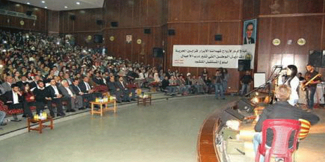 احتفالا بيوم الطالب العربى أقام فرع الإتحاد الوطنى لطلبة سورية فى اللاذقية قبل أيام مهرجانا احتفاليا فى المكتبة المركزية بجامعة تشرين تضمن فقرات فنية متنوعة مجدت بمجملها أرواح شهداء الوطن وتضحياتهم الغالية كما حيت الجيش العربى السورى الباسل وجنوده الأبطال الذين يحققون الإنتصارات على امتداد ساحات الوطن فى مواجهة الإرهاب التكفيرى وقد قام طلاب من المسرح الجامعى بأداء العروض الفنية التى استقطبت المئات من الطلبة فى صفوف الجمهور الى جانب فعاليات أكاديمية ورسمية وشعبية .