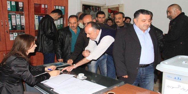 يواصل الوافدون الى محافظة طرطوس من محافظات إدلب والرقة وحلب وريفها الإدلاء بأصواتهم في مركز الصالة الرياضية المخصص لهم في طرطوس.