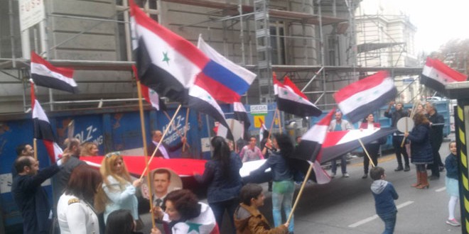 وأضاف البيان الذي ألقته هيرمين قاروط من أبناء الجالية السورية في النمسا أنه “لا أحد يستطيع أن يحيدنا عن التفافنا حول الوطن وقيادته وجيشه الباسل وستحقق سورية نصرا مجيدا ضد الإرهاب والمرتزقة المأجورين والخونة ولن تتمكن قوى الغدر والعمالة من أن تحيدنا عن استقلالية قرارنا وسيادة ووحدة أرضنا والتمسك بمبادئنا”.
