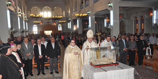 جاء ذلك في عظة قدمها خلال قداس أقيم في كنيسة سيدة النجاة في بلدة زيدل بحمص مساء اليوم برئاسته بمناسبة إعادة ذخائر ورفاة القديس مار اليان من ديره في مدينة القريتين إلى كنيسة سيدة النجاة.