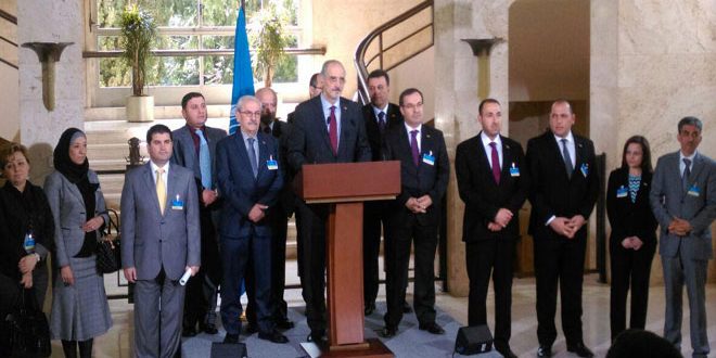 وقال الدكتور بشار الجعفري رئيس الوفد في مؤتمر صحفي عقب الجلسة: “أجرينا جلسة موسعة تطرقنا فيها سويا إلى العديد من المواضيع وجرى الحديث بشكل رئيسي عن التعديلات التي قدمناها على ورقة المبعوث الخاص لا سيما تلك التعديلات المتعلقة بتشكيل حكومة وحدة موسعة وضرورة الضغط على دول الجوار لتنفيذ أحكام قرارات مجلس الأمن ذات الصلة بمكافحة الإرهاب لا سيما القرار 2253”.