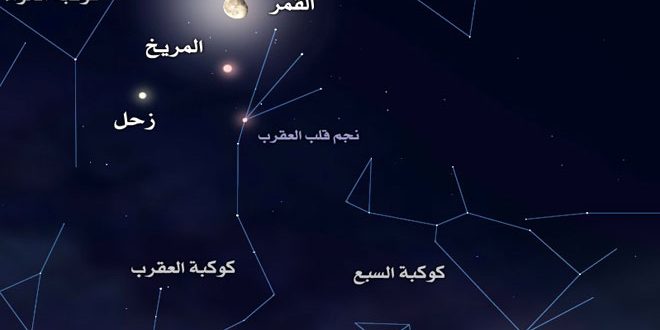 يقترن القمر مع كوكبي المريخ وزحل معاً بدءا من منتصف ليل الأحد المقبل وحتى فجر الثلاثاء على مسافة تبلغ نحو 5 درجات قوسية في كوكبة العقرب.