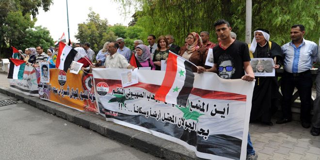 وأكد المشاركون في الاعتصام دعمهم لأهالي الجولان السوري المحتل والأسرى في سجون الاحتلال الاسرائيلي داعين المنظمات الدولية والمجتمع الدولي للضغط على الكيان الصهيوني لاطلاق سراح الأسرى والمعتقلين السوريين والعرب في سجونه.