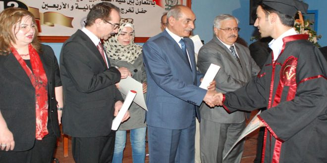 وفي كلمة الخريجين قال الطالب عبيدة معروف “تخرجنا اليوم حصاد عمل استمر سنوات استلزم الكثير من الجهد لتحقيقه خلال الظروف الصعبة التي يعيشها وطننا وبهذا نقدم مثالا حيا عن ثقافة وفكر وصمود الشعب السوري الذي كان العلم أحد أهم مقوماته”.