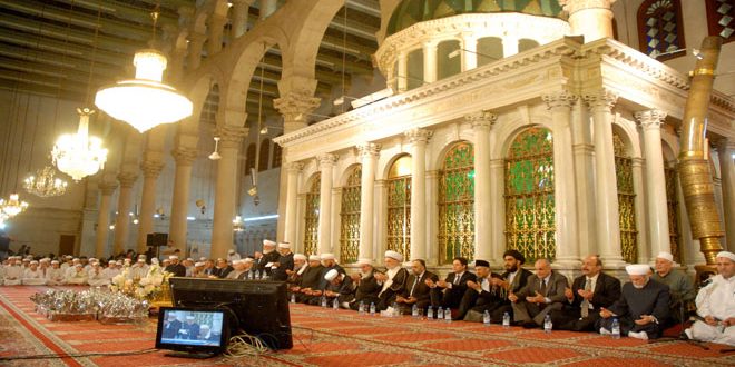 ففي جامع بني أمية الكبير بدمشق أقامت وزارة الأوقاف احتفالا دينيا بالمناسبة تضرع المشاركون فيه إلى الله أن يحمي حلب وأهلها في وجه الاعتداءات الإرهابية المتصاعدة التي يتعرضون لها للنيل من صمودهم وتمسكهم بأرضهم.