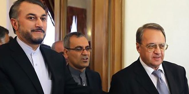 بحث مساعد وزير الخارجية الايراني للشؤون العربية والافريقية حسين أمير عبد اللهيان في موسكو اليوم مع ممثل الرئيس الروسي لبلدان الشرق الأوسط وافريقيا نائب وزير الخارجية ميخائيل بوغدانوف الوضع في سورية والعراق وفلسطين واليمن.