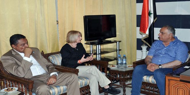 بحث محافظ حمص طلال البرازي مع مديرة وكالة الأمم المتحدة لشؤون نزع الألغام أغنيس ماركايو والوفد المرافق اليوم واقع العمل الإنساني بمحافظة حمص وسبل تعزيز التعاون في مجال إزالة الألغام والبقايا المتفجرة التي خلفتها التنظيمات الإرهابية المسلحة في عدد من أحياء المدينة.