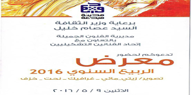 تنظم مديرية الفنون الجميلة في وزارة الثقافة بالتعاون مع اتحاد الفنانين التشكيليين معرض الربيع السنوي 2016 وذلك عند الساعة الـ12 من ظهر يوم الاثنين القادم في صالة “محمد الوهيبي” بالمركز التربوي للفنون التشكيلية بدمشق.