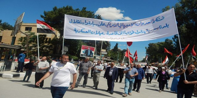 ونظمت فعاليات اجتماعية وشعبية في مدينة الحسكة يوم أمس وقفة احتجاجية في ساحة القائد المؤسس حافظ الأسد ضد العدوان السافر المتمثل بدخول 150 جنديا أمريكيا إلى رميلان بريف القامشلي .