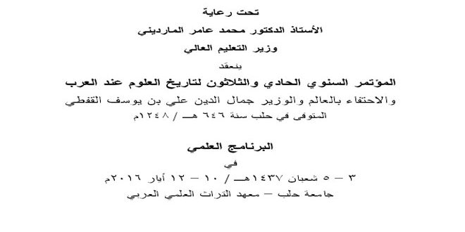 تبدأ غدا فعاليات المؤتمر السنوي الحادي والثلاثون لتاريخ العلوم عند العرب الذي تقيمه جامعة حلب ومعهد التراث العلمي العربي في الجامعة على مدرج المعهد.