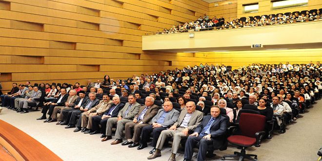 بمناسبة عيدي العمال والشهداء كرمت جامعة دمشق اليوم 54 عاملا من كوادرها الإدارية المتميزة وذوي الشهداء العاملين فيها خلال حفل على مدرج الجامعة.