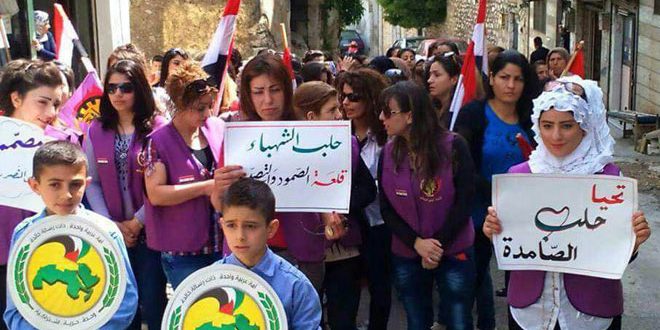 نظمت فعاليات نسائية واجتماعية وأهلية وطلابية في منطقة مصياف اليوم وقفة تضامنية مع أهالي حلب بعنوان “حلب الصامدة” أكد المشاركون فيها تضامنهم مع أهالي مدينة حلب في وجه الإرهاب الممنهج الذي يتعرضون له.