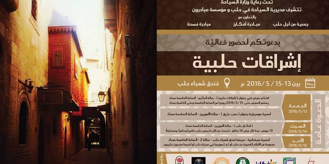 يشار إلى أن فعالية “إشراقات حلبية” ستقام في فندق شهباء حلب بدءا من الساعة الخامسة والدعوة عامة.