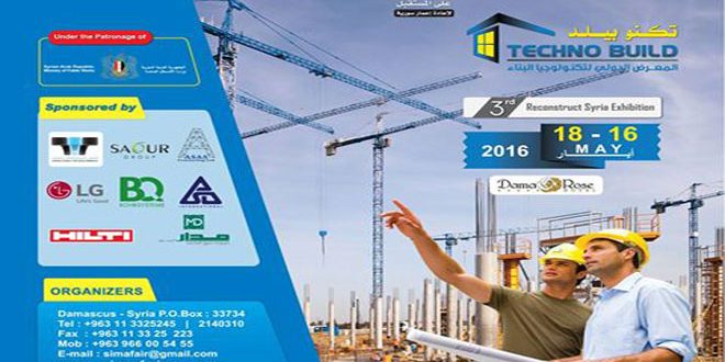 تنطلق غدا الاثنين في فندق داما روز بدمشق فعاليات المعرض الدولي لتكنولوجيا البناء “تكنوبيلد 2016” الذي تنظمه المؤسسة السورية الدولية للتسويق “سيما” برعاية وزارة الأشغال العامة وبدعم منها ومن اتحاد غرف التجارة السورية والمجلس السوري للمعادن والحديد الصلب وذلك بمشاركة أكثر من 40 شركة سورية وعربية متخصصة في مجال البناء والتشييد والتطوير العقاري وخدماتها.