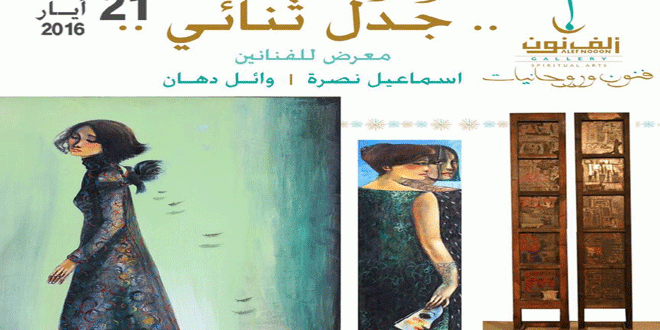 تستضيف صالة ألف نون للفنون والروحانيات معرضا بعنوان “جدل ثنائي” عند السادسة من مساء السبت القادم بمشاركة التشكيلي اسماعيل نصرة والنحات وائل دهان.