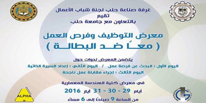 وأوضحت اللجنة في بيان لها تلقت سانا نسخة منه أن المعرض الذي سيقام في صالة كلية الهندسة المعمارية بجامعة حلب تحت شعار “معا ضد البطالة” يحقق الفائدة الأكبر لطالبي الوظائف وأصحاب الشركات ولا سيما في هذه المرحلة من أجل تأمين فرص العمل والحد من البطالة ما أمكن إضافة إلى تطوير ثقافة التوظيف لدى شريحة الشباب.