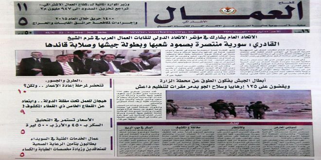 واحتوى العدد كلمة لرئيس الاتحاد العام لنقابات العمال جمال القادري التي ألقاها خلال أعمال المؤتمر العام الثالث عشر للاتحاد الدولي لنقابات العمال العرب في مدينة شرم الشيخ بمصر حيث بين أن التكفير هو أكثر أنواع التخلف الذي يحاول أن يقصي أجزاء كبيرة من الوطن العربي داعيا للعمل لتعميق الوعي المجتمعي العام لمواجهة هذا الفكر.
