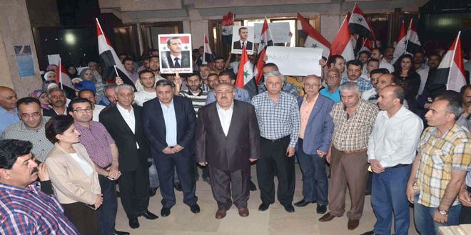 المشاركون الذين حملوا الأعلام الوطنية ولافتات تعبر عن وحدة الصف السوري في مواجهة الإرهاب اعتبروا أن استهداف المدنيين من أطفال ونساء وشيوخ يعكس بشكل واضح وجلي حقيقة أصحاب الفكر الظلامي التكفيري.