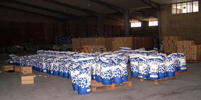 وذكر مدير التجارة الداخلية وحماية المستهلك احمد نجم في تصريح لـ سانا أن الكميات في المستودع تتوزع بين 55 طنا من حليب الأطفال و14 طنا من الرز و5ر1 طن فاصولياء حب يابسة وطن واحد من العدس.