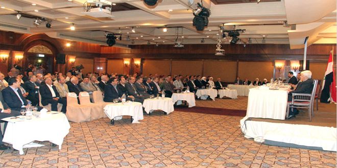 وأشار وزير الصناعة كمال الدين طعمة في كلمة له خلال الاجتماع إلى أن القطاع الصناعي بشقيه العام والخاص تعرض لأضرار كبيرة بسبب الحرب الظالمة التي تشنها العصابات الإرهابية لافتا إلى أن الحكومة تعمل ضمن الأولويات لتأمين متطلبات الصمود وتتبنى سياسة الدعم في الصحة والتعليم ورغيف الخبز والمشتقات النفطية وغيرها.