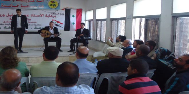 وأدى الفنان فراس إبراهيم يرافقه على العود العازف رئيف إبراهيم وفايز أسعد على الإيقاع عددا من الأغاني الوطنية التي تشحذ الهمم وتنمي حس المقاومة في انفعال جماهيري منسجم مع العبارات التي تتحدى الإرهاب والموءامرة على سورية إضافة إلى المعزوفات الفنية التي قدمتها منظمتا اتحاد شبيبة الثورة والشبيبة التقدمية الفلسطينية ترافقها وصلات دبكة مع أغان مقاومة.