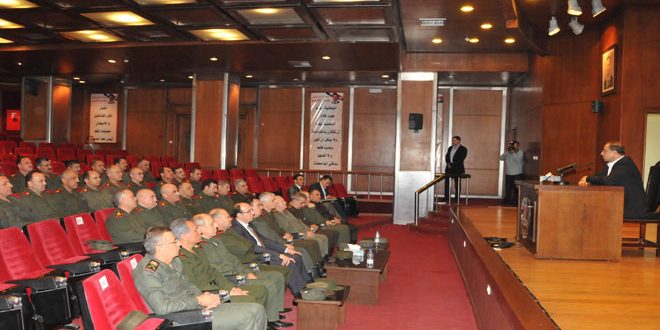 وأشار اللواء الشعار خلال لقائه الضباط خريجي دورة القيادا ت العليا في مبنى وزارة الداخلية إلى اهمية ترسيخ الانتماء الوطني والحفاظ على القيم والأخلاق ومواجهة الاخطار والتحديات وأن يكون ضباط وعناصر قوى الأمن الداخلي على المستوى الذي يكفل نهوضهم بالمهام الملقاة على عاتقهم في كل ظروف الأزمة والحرب الجائرة على سورية.