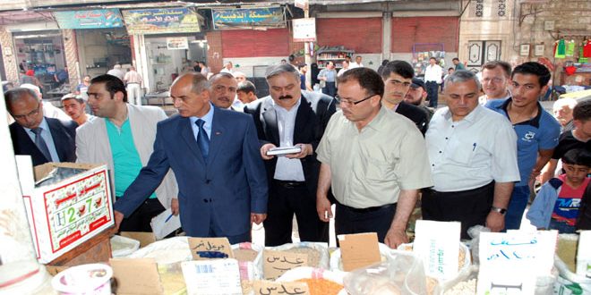 رافق المحافظ في جولته رئيس مجلس المحافظة وعضو المكتب التنفيذي لقطاع التجارة الداخلية والصناعة ومدير التجارة الداخلية وحماية المستهلك بحماة.