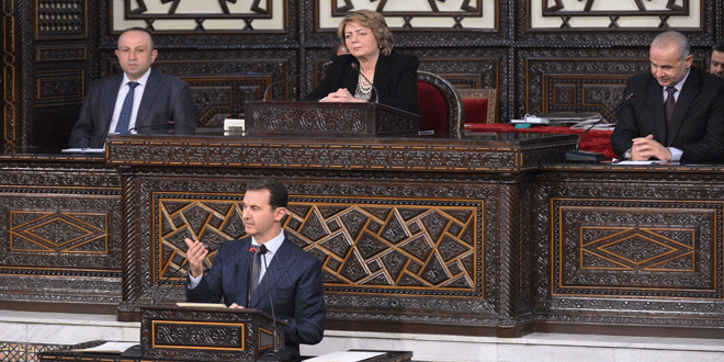 وقال الرئيس الأسد في كلمة له أمام مجلس الشعب بمناسبة الدور التشريعي الثاني: إن حربنا ضد الإرهاب مستمرة ليس لأننا نهوى الحروب فهم من فرض الحرب علينا لكن سفك الدماء لن ينتهي حتى نقتلع الإرهاب من جذوره أينما وجد ومهما ألبس من أقنعة.. وكما حررنا تدمر وقبلها كثير من المناطق سنحرر كل شبر من سورية من أيديهم فلا خيار أمامنا سوى الانتصار وإلا فلن تبقى سورية ولن يكون لأبنائنا حاضر ولا مستقبل.