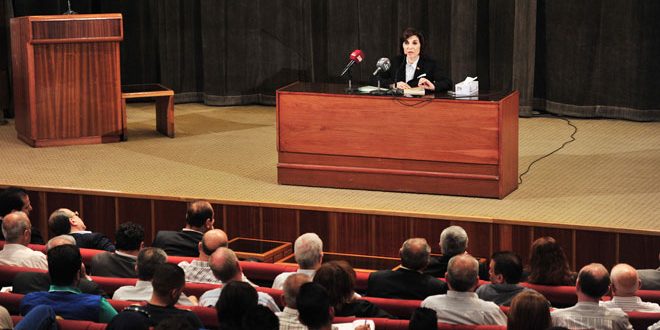 الدكتورة شعبان خلال ندوة بمناسبة الذكرى السادسة عشرة لرحيل القائد المؤسس حافظ الأسد