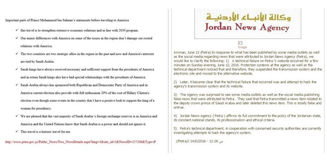 ونشر الموقع صورة عن التقرير الذي نشرته وكالة بترا الأردنية باللغة الإنجليزية قبل أن تقوم الوكالة بحذفه وإصدار بيان نفت فيه نشر التقرير وقالت إن موقعها الإلكتروني تعرض للاختراق لبعض الوقت كما اتصلت شركة العلاقات العامة الأمريكية بموقع ميدل إيست آي وطلبت منه تصحيح الخبر.